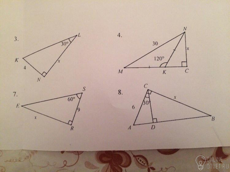3: KL=8, NL=4*sqrt(3); 4: CN=15; 7: ER=9*sqrt(3);8: CB=10. (* - умножить, sqrt - корень.). Вроде так.