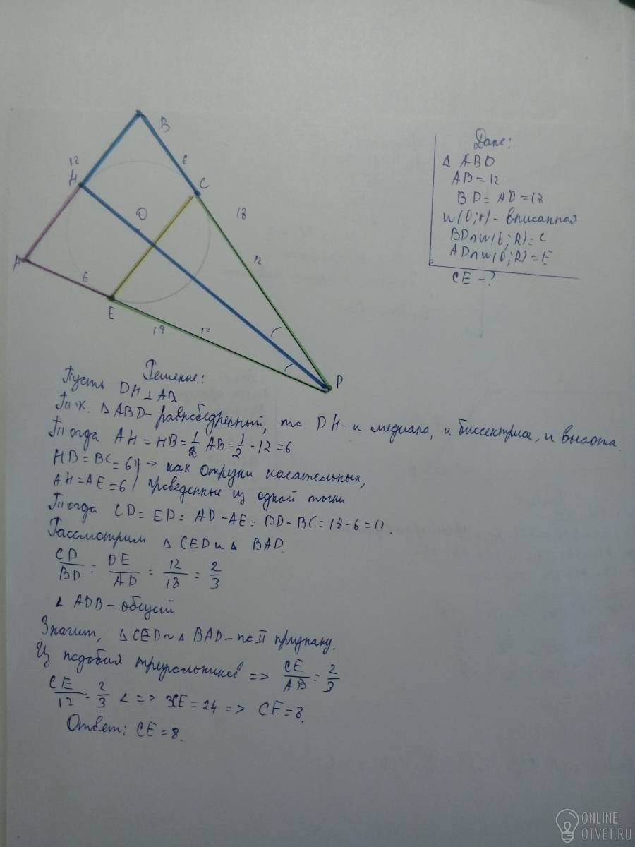 Вписанная окружность касается боковых сторон в точках С и Е. Найдите СЕ.