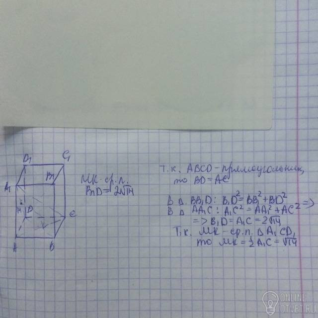 Abcda1b1c1d1 прямоугольный параллелепипед вычислите длину средней линии треугольника A1DC, параллельной стороне A1C, если известно, что B1D = 2√14