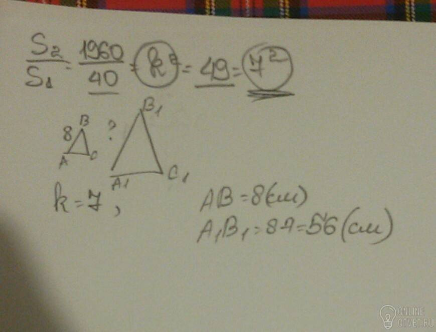 Площади двух подобных треугольников в 40 метров^2 и 1960 м^2. Одна из сторон первого треугольника в 8м. Найдите сходственную ей сторону второго треугольника и отношение периметров данных треугольников