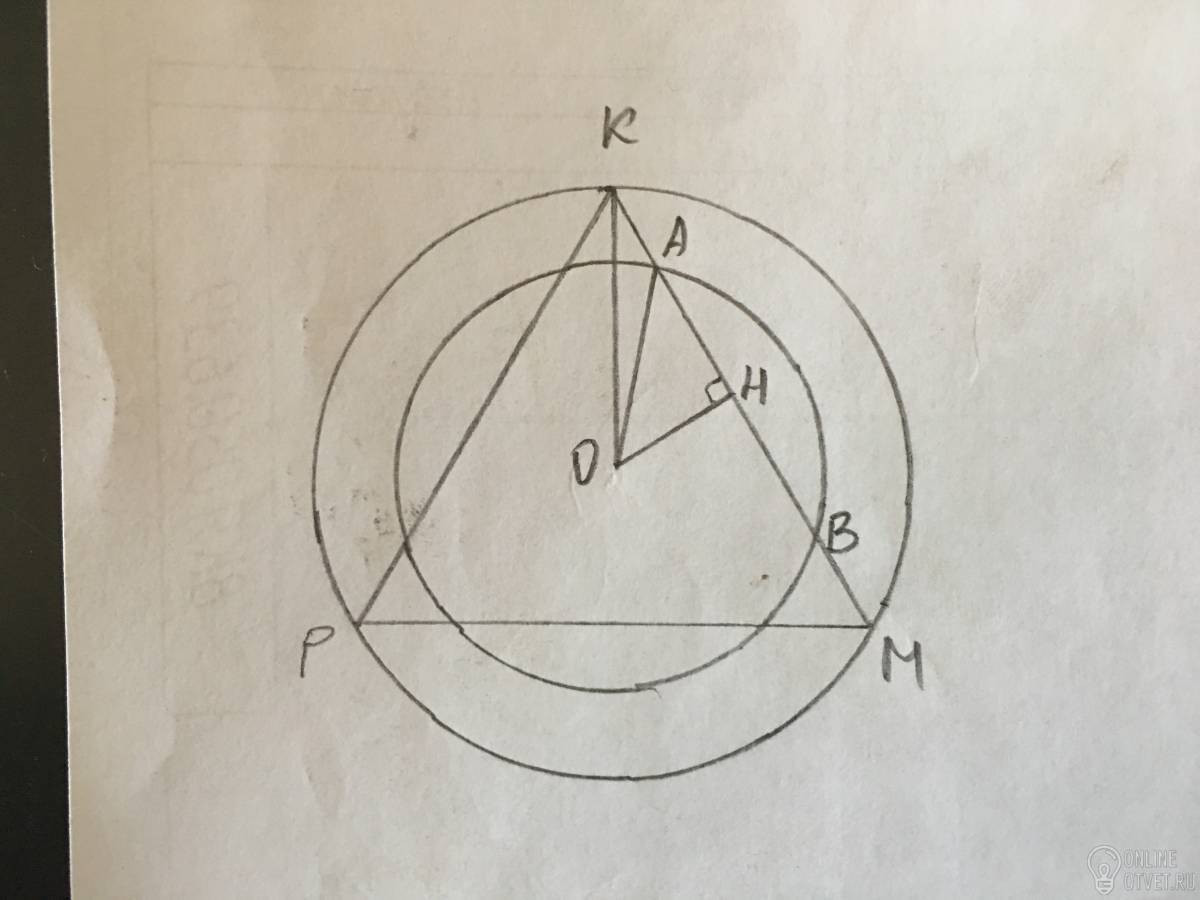 Так как окружности с радиусами ОК и ОА концентрические и треугольник КМP правильный, то заштрихованные сегменты равны.