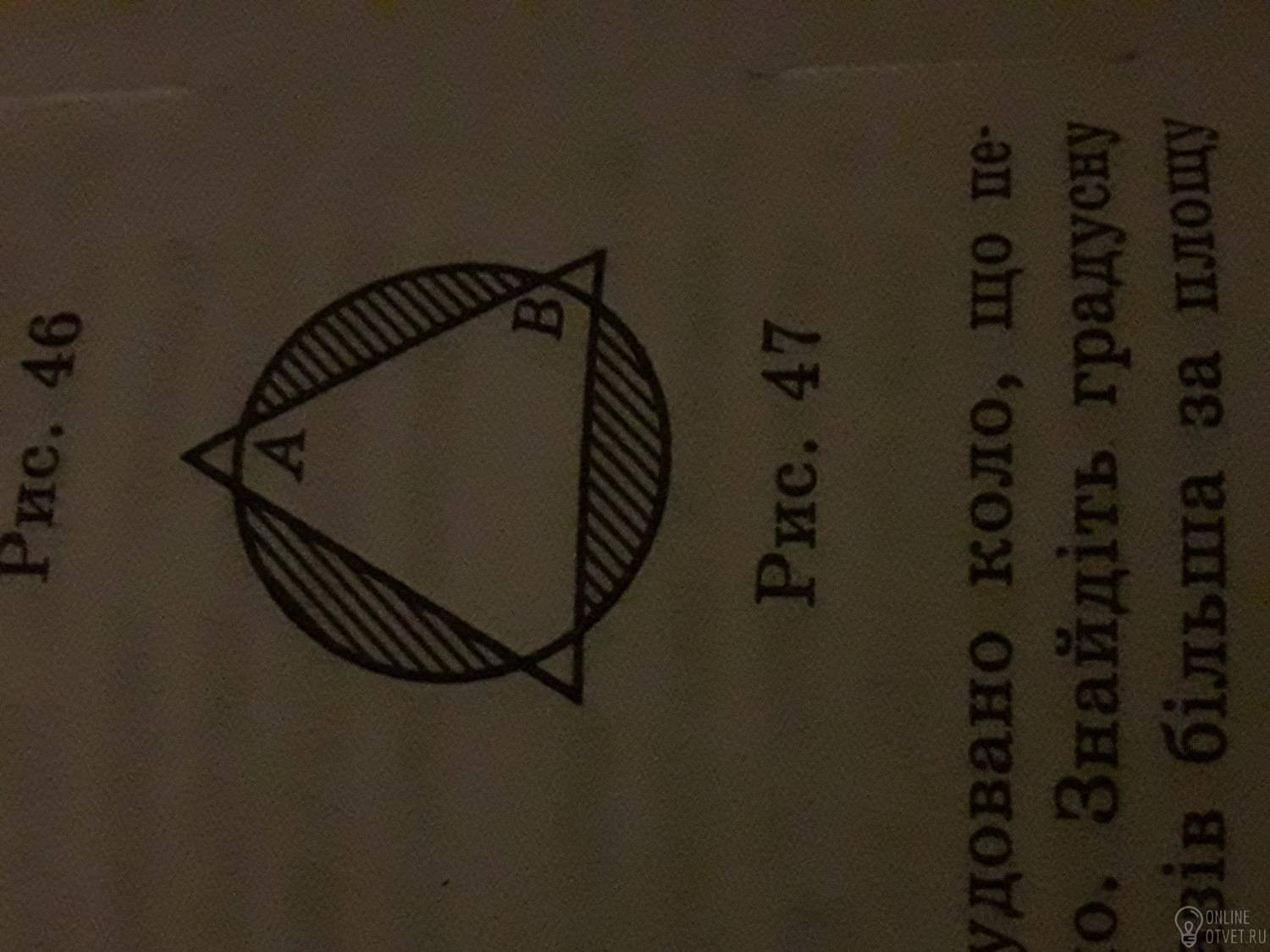 Центры круга и правильного треугольника, изображенных на рис.47, совпадают. Сторона треугольника = 10 * корень из 3. Длина хорды АВ = радиусу окружности, описанной около треугольника. Найдите площадь заштрихованной фигуры.