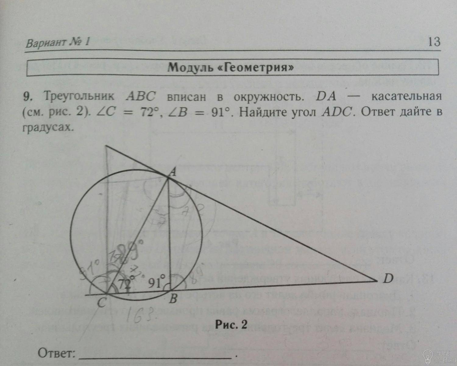 Так как DA - косательная, то угол CAD=90гр. Соответственно угол BAD=90-CAB=90-17=73гр. (угол CAB=180-91-72=17гр - сумма углов в любом треугольнике равна 180 градусов)
