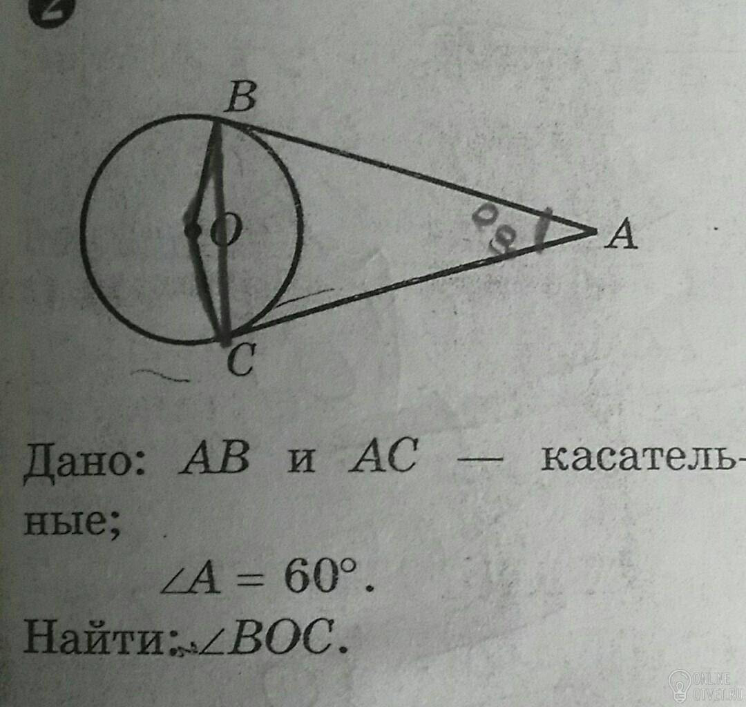 2) Рассмотрим треугольник BAO. Угол OBA равен 90° (главное свойство касательных), угол BAO равен 60°/2=30°. Ровно то же самое — для треугольника ACO (ведь они равны — по трём равным сторонам: BO и CO равны как радиусы, CA и BA равны как отрезки, соединяющие точки касания с точкой пересечения касательных, а OA — общая сторона).