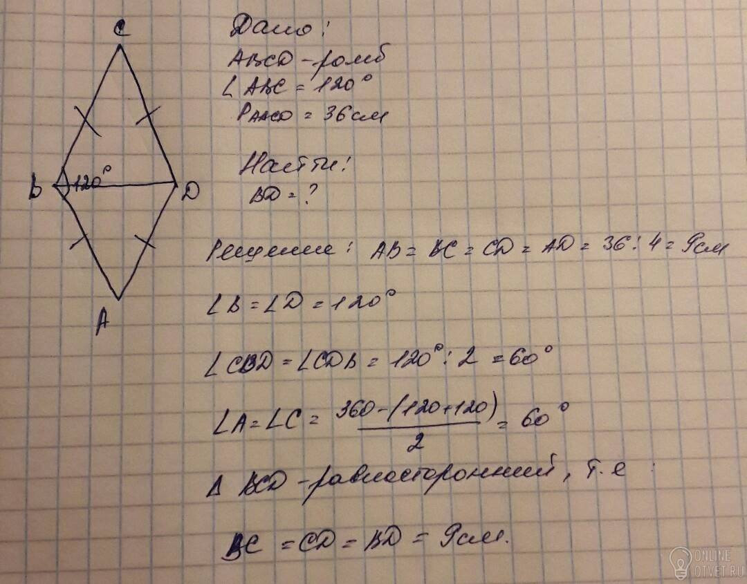 Периметр ромба ABCD 36см. зная что мера угла ABC 120 градусов. найти длину диагонали BD