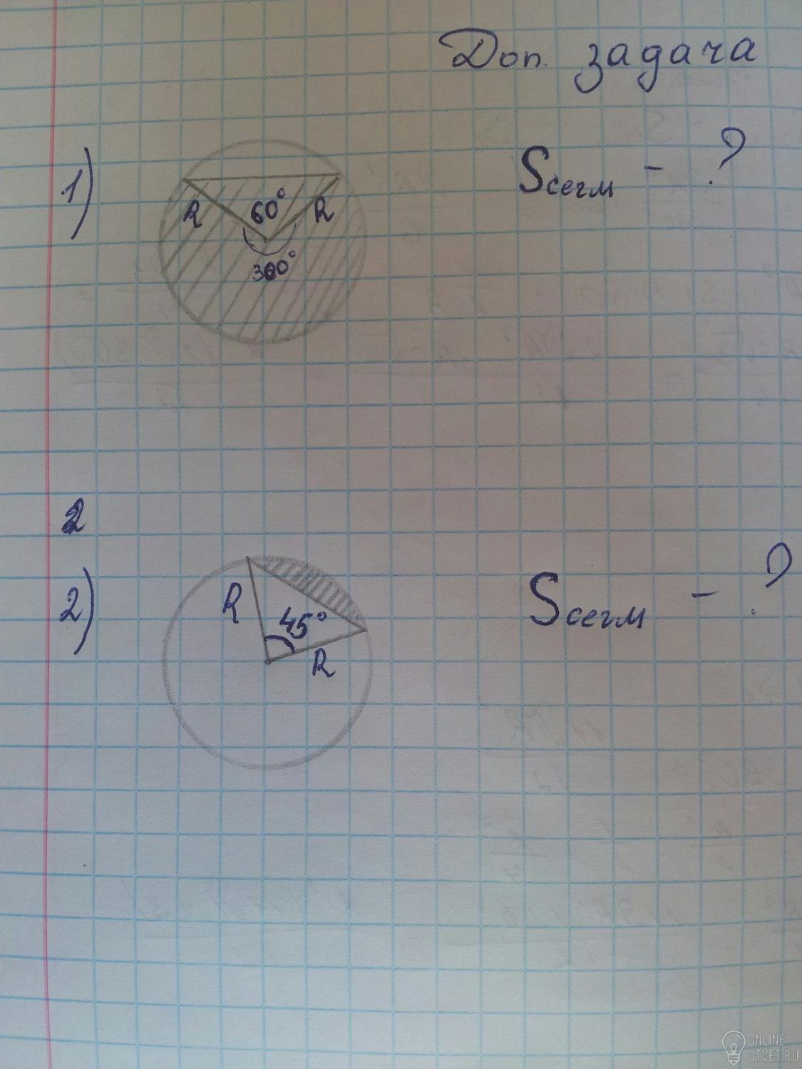 S=((π·45/180)-√2/2)·R²/2=(π/4-2√2/4)·R²/2=(π-2√2)·R²/8 - это ответ.