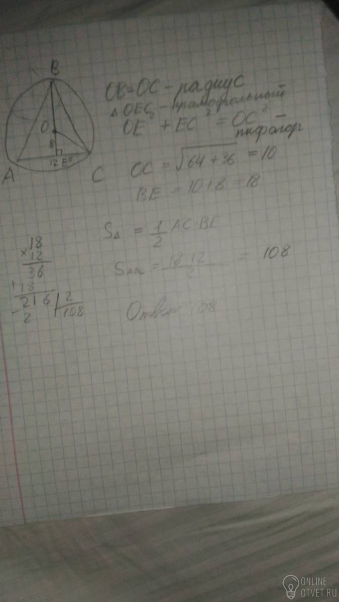 Помогите пожалуйста,срочно нужно ,завтра уже надо здать!!!Заранее спасибо!!!Дан равнобедренный треугольник центр описанной окружности лежит на высоте проведенной к основанию меньший отрезок равен 8 см.основание отрезка12 см