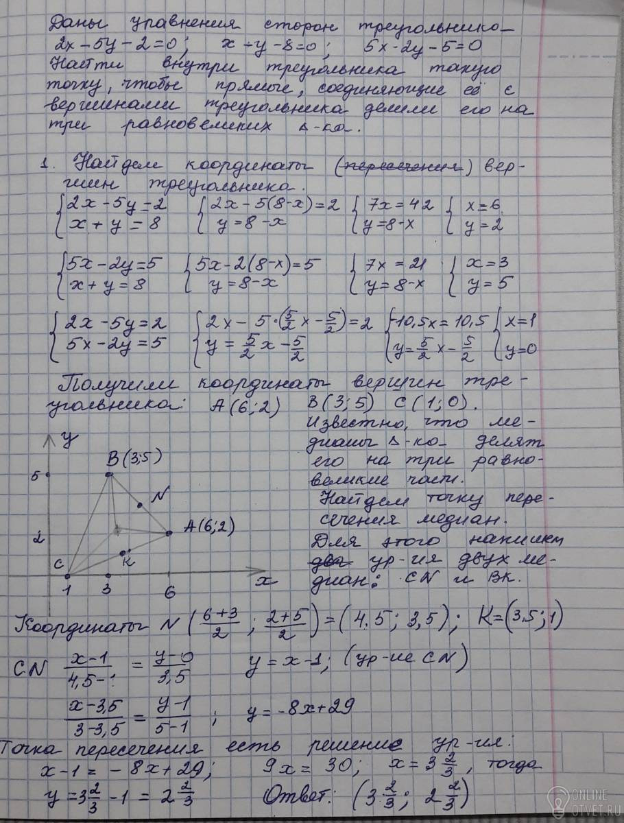 Даны уравнения сторон треугольника: 2х-5у-2=0, х+у-8=0 и 5х-2у-5=0. Найти внутри треугольника такую точку, чтобы прямые, соединяющие ее с вершинами треугольника, разбивали его на три равновеликих тр-ка.