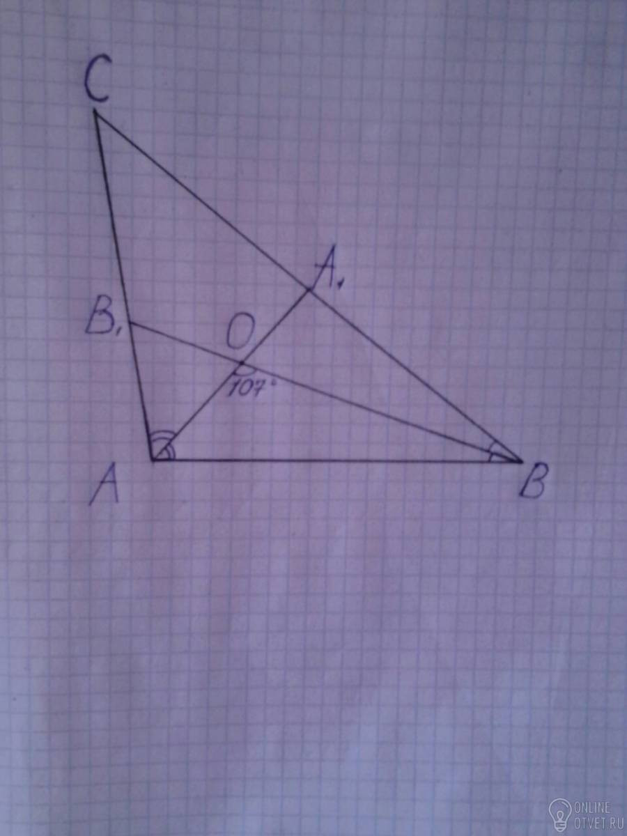 Рассмотрим Δ АОВ. ∠AOB=107° - по условию. Так как ВВ1 биссектиса и делит угол АВС пополам ∠ АВО= 1/2∠АВС=1/2*30=15°