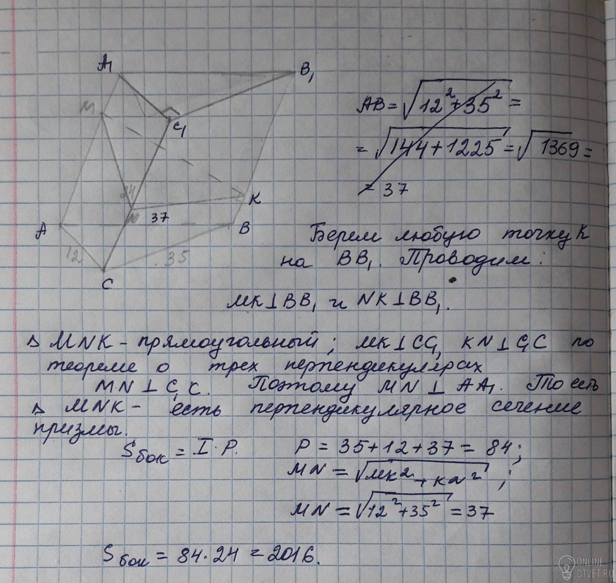 В наклонной треугольной призме,две боковые грани взаимно перпендикулярны,а их общее ребро,отстоящее от 2 других боковых ребер на 12 и 35 см,равно 24 см.Найдите площадь боковой поверхности призмы.
