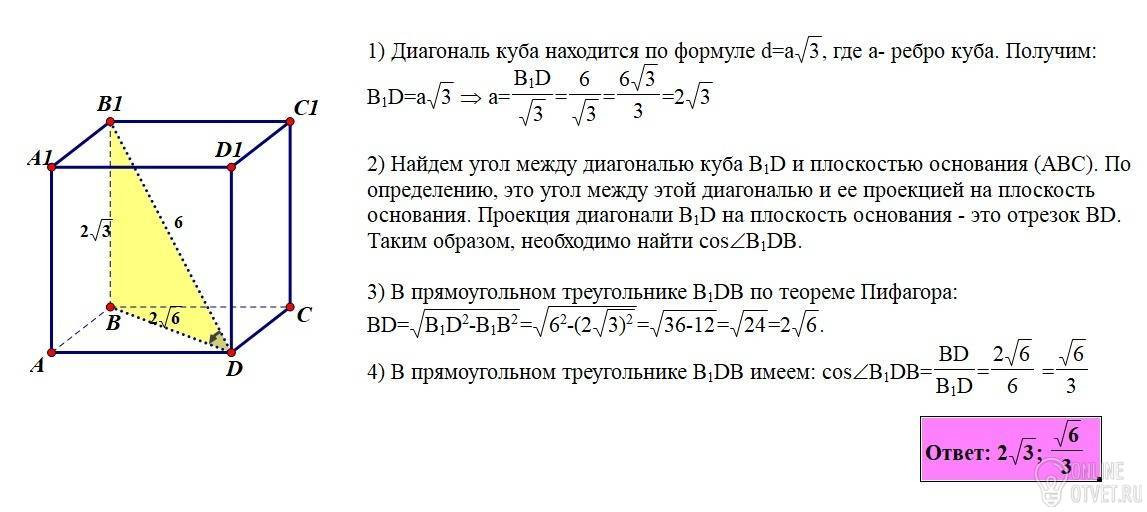 Помогите!диагональ куба равна 6 см . Найдите: а)ребро куба б)косинус угла между диагональю куба и плоскостью одной из его граней.