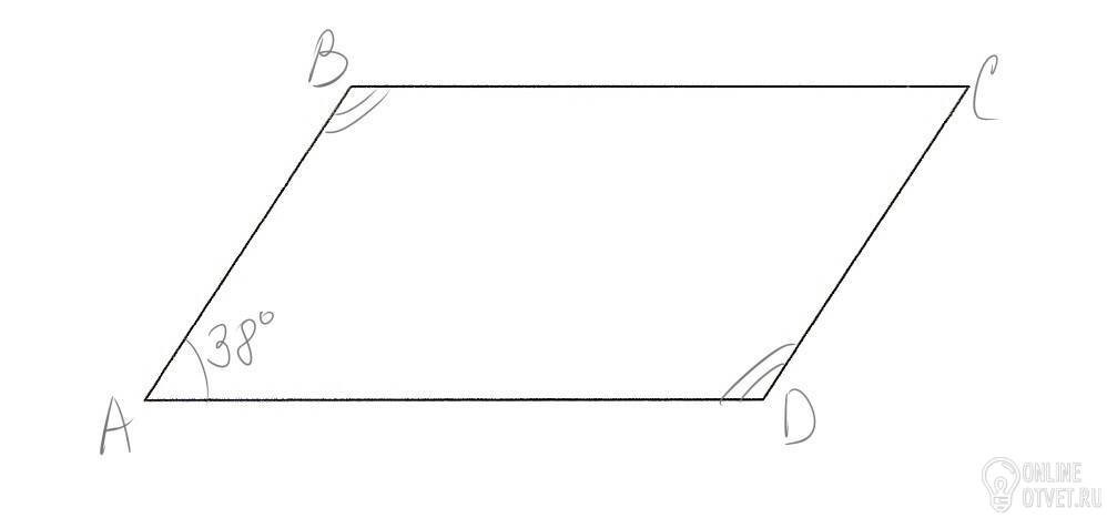 Один из углов параллелограмма ABCD РАВЕН 38 градусов . найдите остальные неизвестные углы параллелограмма