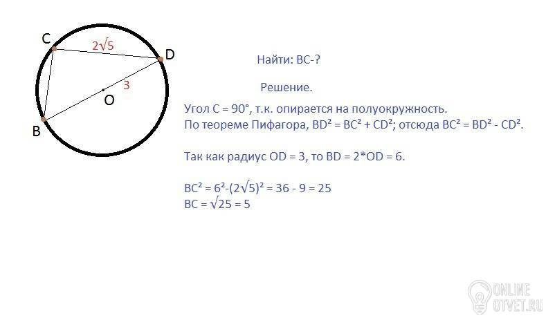 BC и CD - хорды окружности, BD -её диаметр. Найдите длину хорды BC, если радиус окружности равен 3, CD = 2√5 помогите пожалуйсто.