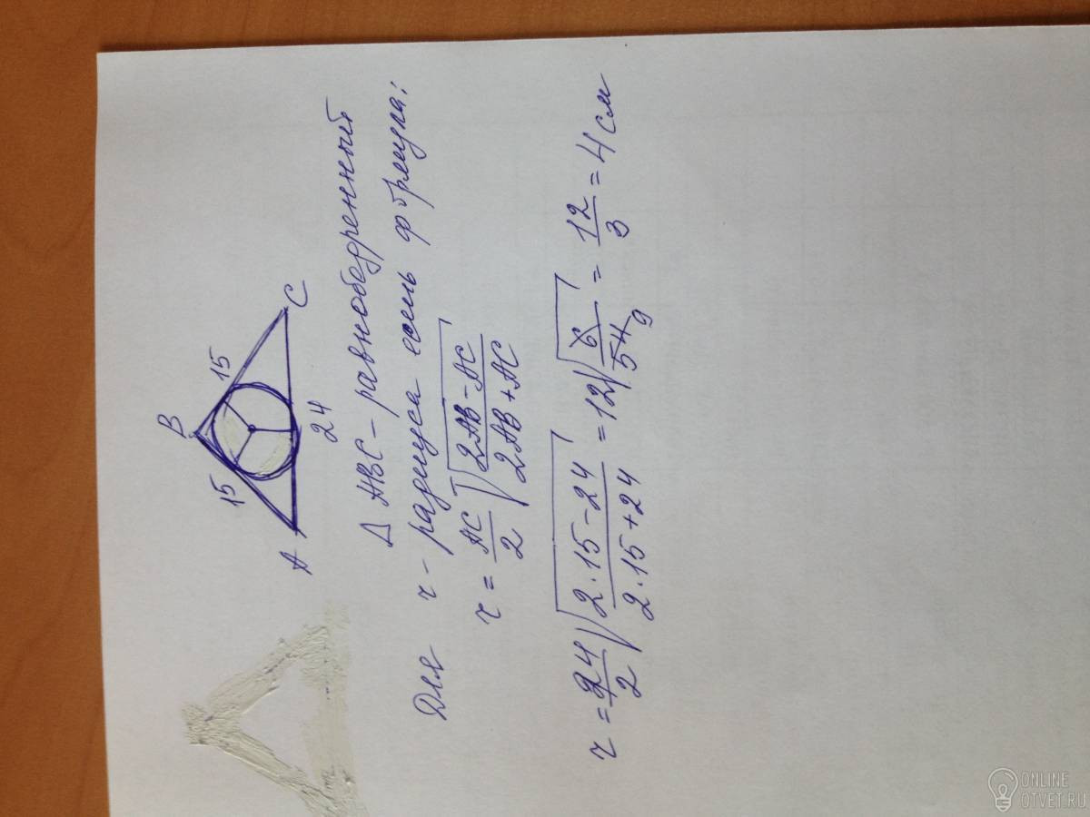 Найдите радиус окружности вписанной в треугольник со сторонами 15, 24 и 15