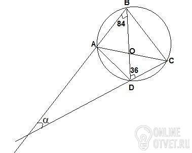 Четырехугольник ABCD вписан в окружность,О-точка пересечения его диагоналей, ∠ABD=84°,∠BDC=36°. Найдите угол между прямыми AB и DC.