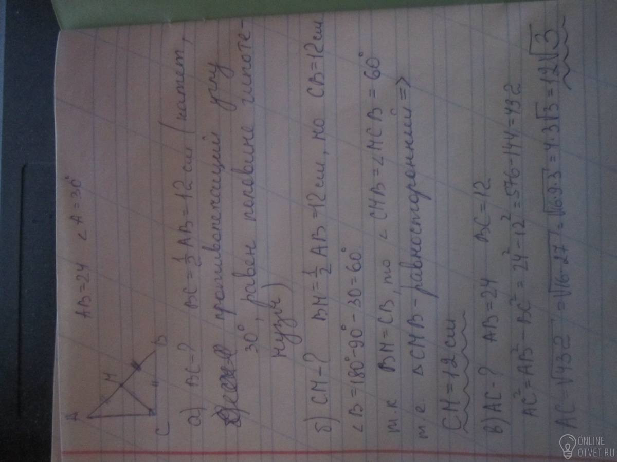 В прямоугольном треугольнике АВС проведена медиана СМ. Известно, что АВ=24, угол С равен 90, угол А равен 30 а) найдите длину катета ВС Б) найдите длину медианы СМ в) найдите значение АС