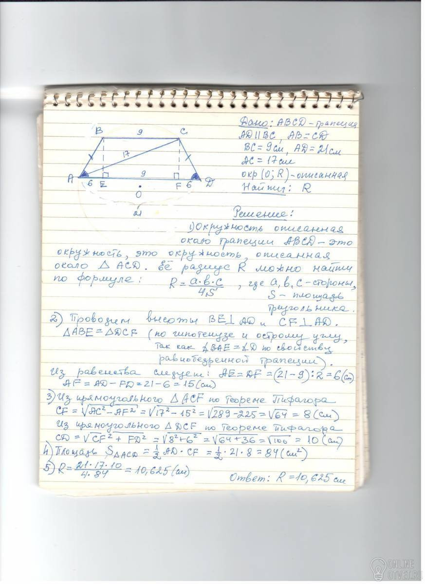 Основи рівнобічної трапеції дорівнюють 9 см і 21 см, а діагональ 17 см. Знайдіть радіус кола, описаного навколо даної трапеції