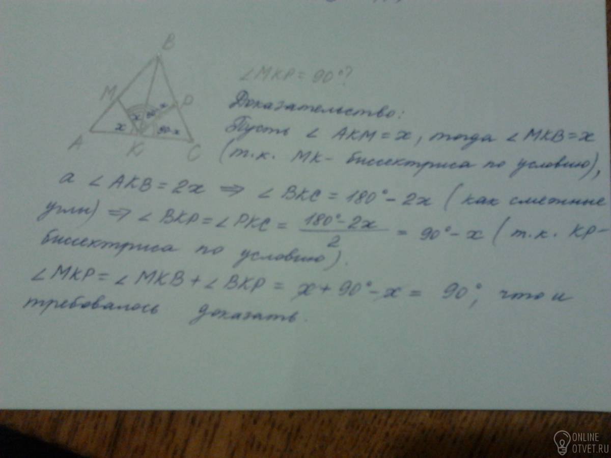 На сторонах АВ, ВС, АС треугольника АВС взяты точки М, Р, К соответственно, так, что лучи КМ и КР являются биссектрисами углов АКВ и ВКС. Доказать, что угол МКР=90 градусов.