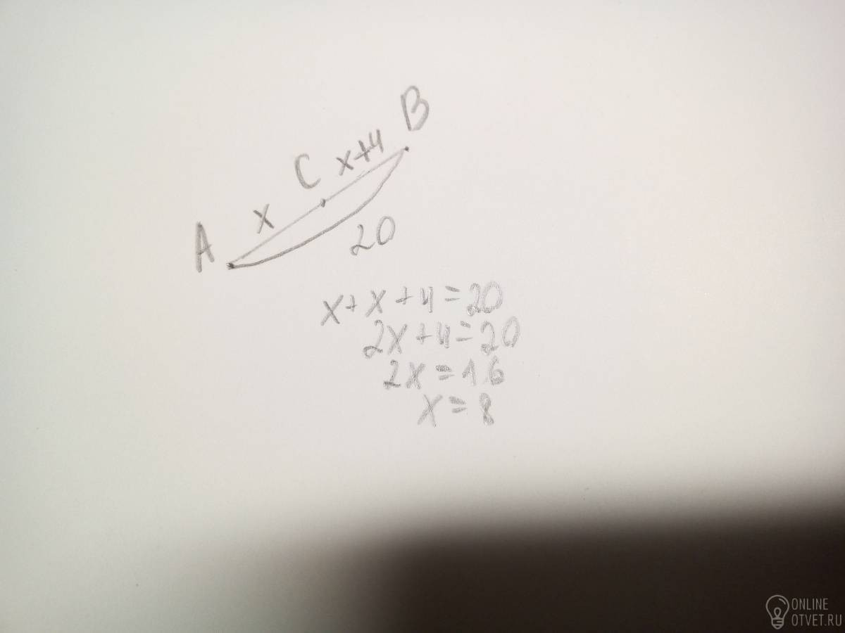 На отрезке АВ длиной 20 см отмечена точка С. Найдите длины отрезков АС, ВС, если отрезок ВС на 4 см длиннее отрезка АС.