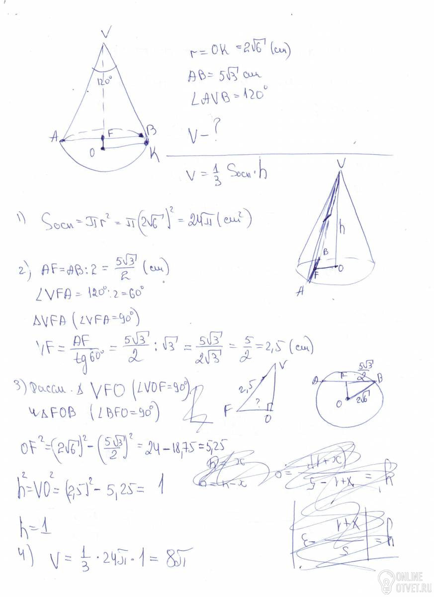 Дан прямой круговой конус с вершиной V и радиусом основания 2√6 см. Длина хорды AB из основания конуса равна 5√3 см и мера угла AVВ = 120 градусов. Найдите объем конуса.