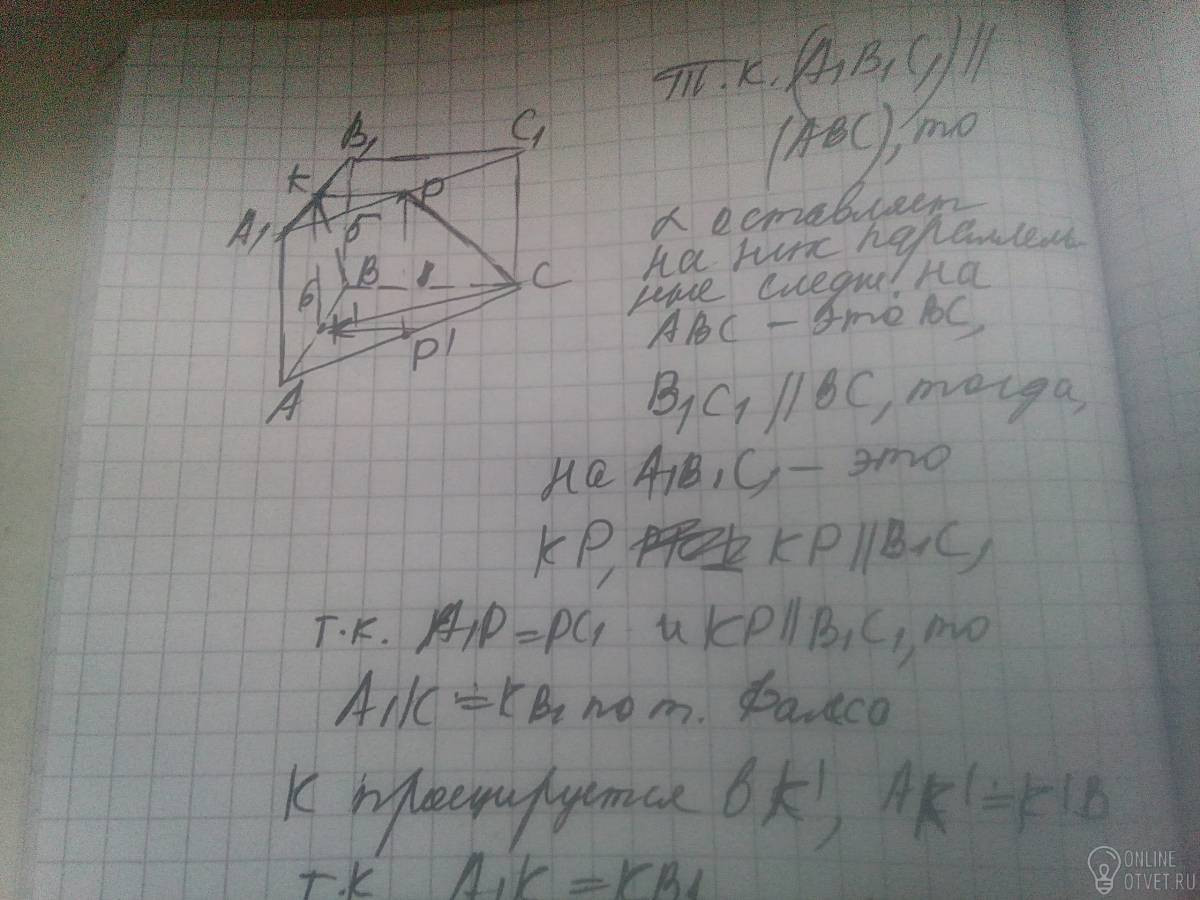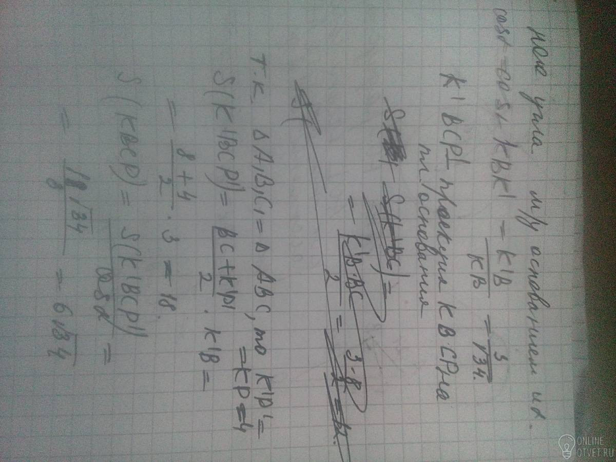 Основание прямой призмы – прямоугольный треугольник, катеты которого равны 6 см и 8 см. Высота призмы равна 5 см. Через больший катет нижнего основания и середину гипотенузы верхнего основания проведена плоскость.Вычислите площадь сечения этой плоскости