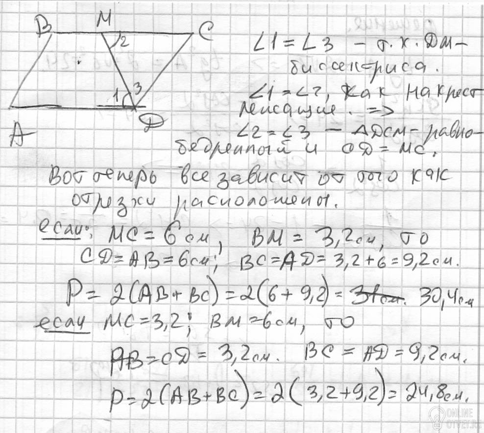 В паралелограмі ABCD Бісектриса кута D ділить сторону BC на відрізки 6 і 3.2см, знайти периметр!