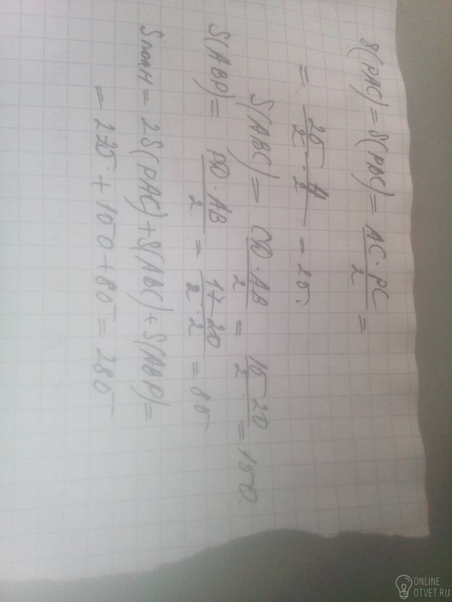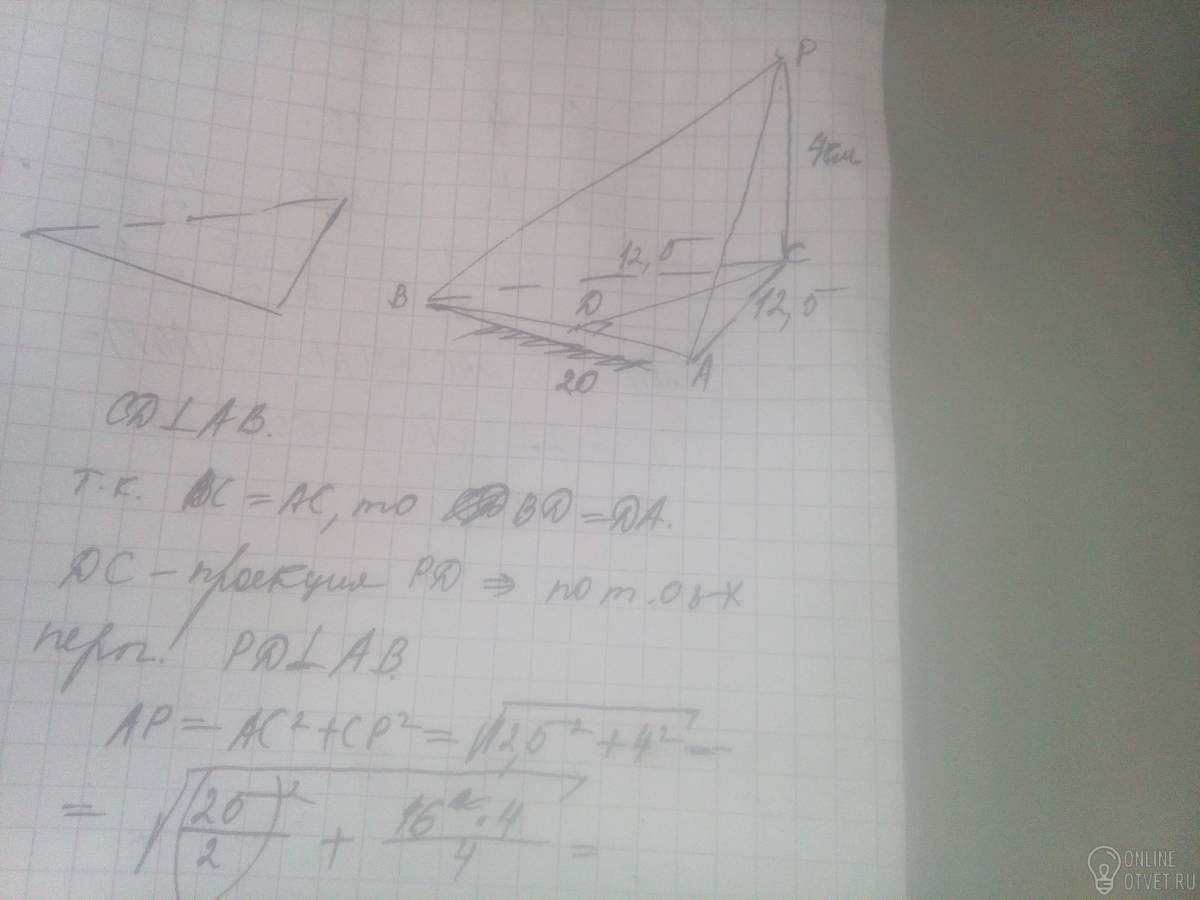 Основание пирамиды равнобедренный треугольник , со сторонами 20 см,12,5см,12,5см.Ее высота проходит через вершину угла противолежащего большой стороне и равна 4 см.Найдите боковую поверхность пирамиды.