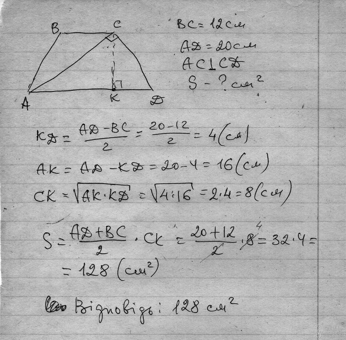 Діагональ рівнобічної трапеції перпендикулярна до її бічної сторони.Знайти площу трапеції,якщо її основи дорівнюють 12 см і 20 см.