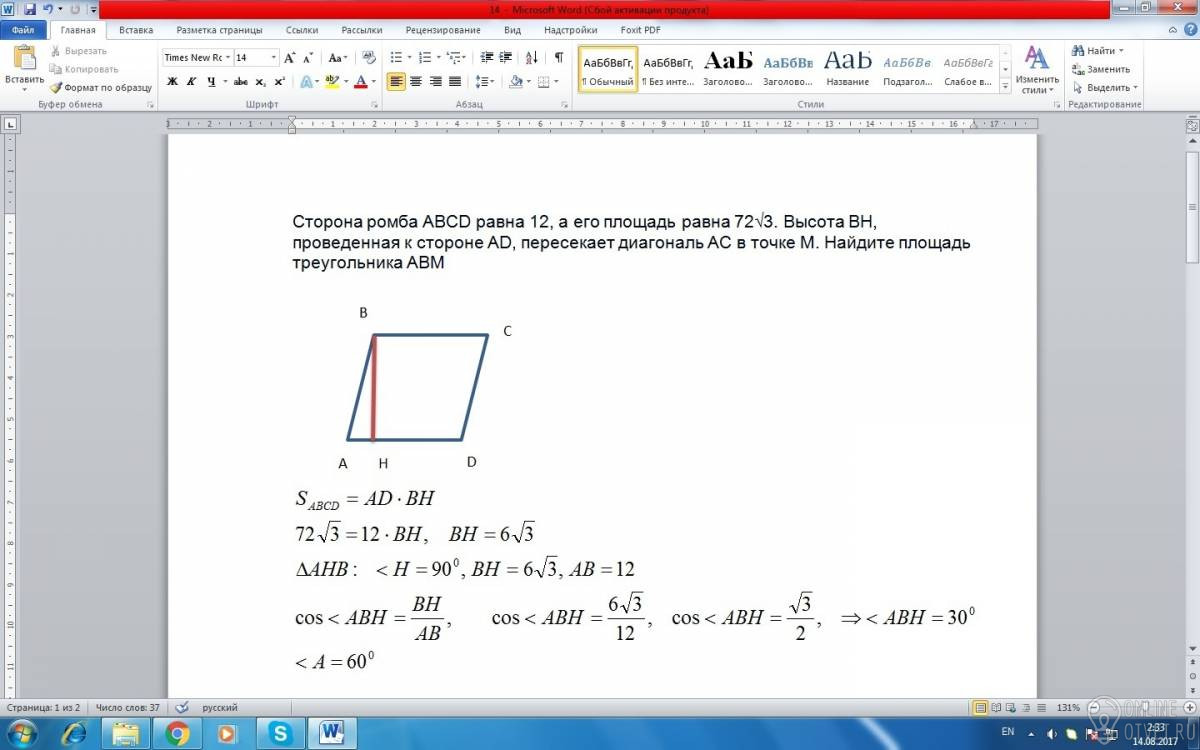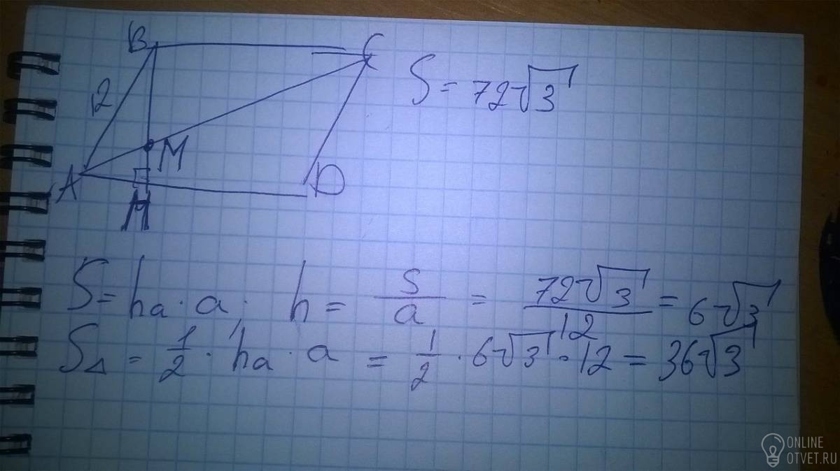 Сторона ромба ABCD равна 12, а его площадь равна 72√3. Высота BH, проведенная к стороне AD, пересекает диагональ AC в точке M. Найдите площадь треугольника ABM