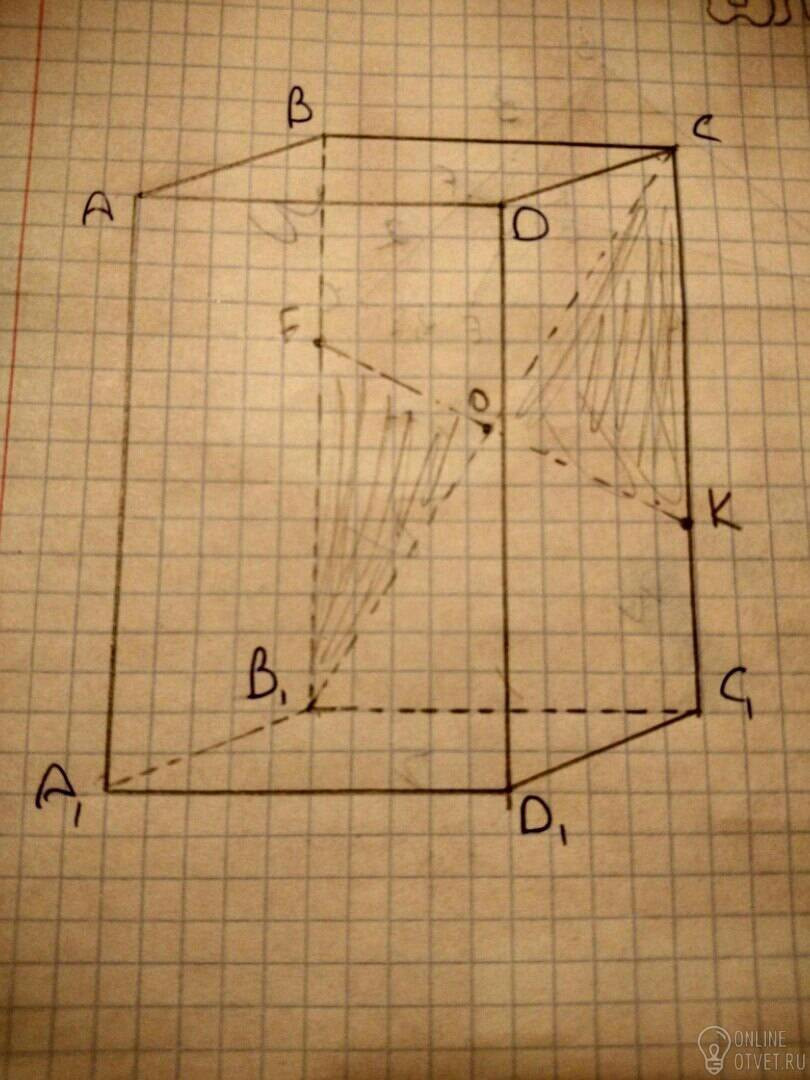 Изображен прямоугольный параллелепипед, точки k и f лежат на ребрах СС1 и BB1 соответственно. Прямая СB1 проходит через точку O-середину отрезка KF. Докажите, что треугольник KCO = треугольнику FB1O