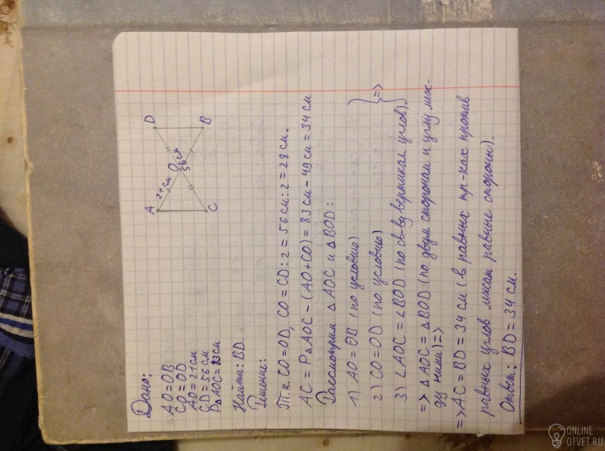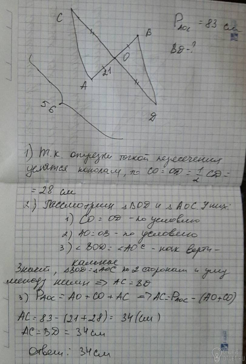 Отрезки АВ и СD пересекаются в точке О и точкой пересечения делятся пополам. АО = 21 см, СD = 56 см , а периметр треугольника AOC равен 83 см. Найдите длину стороны BD. Ответ дайте в сантиметрах.