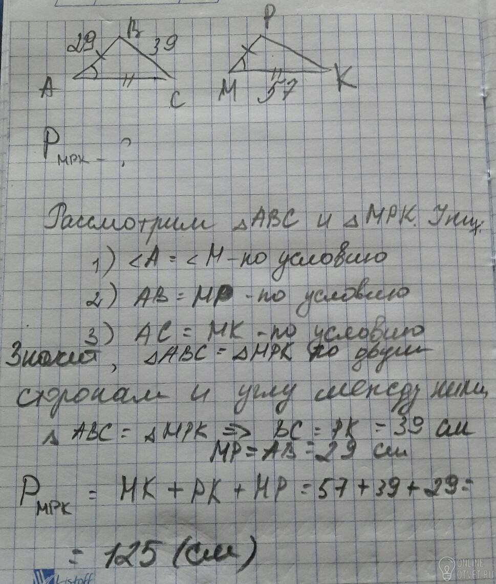 В треугольниках АВС и МРК ∠А = ∠М, АВ = МР и АС = МК. Найдите периметр треугольника МРК, если АВ = 29 см, ВС = 39 и МК = 57 см. Ответ дайте в сантиметрах.