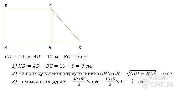 Більша бічна сторона прямокутної трапеції дорівнює 10 см. Знайти площу, якщо основи дорівнюють 5 і 13
