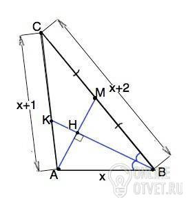 Примем сторону АВ=х, АС=х+1, ВС=х+2