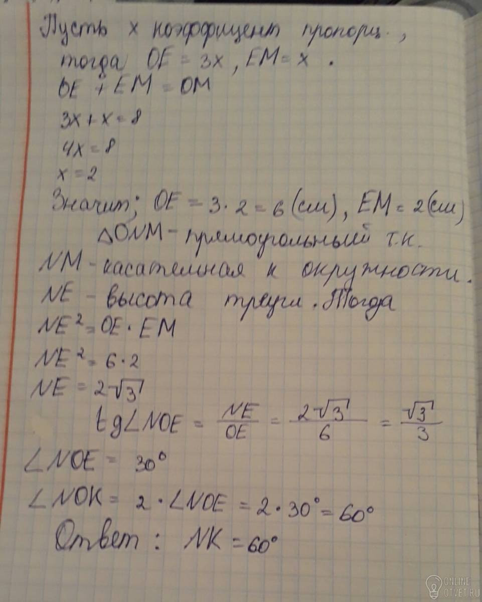 Точки M и K - точки касания. Найти градусную меру дуги NK если OM=8 хорда NK делит отрезок OM точкой Е в отношении 3:1 считая от точки О