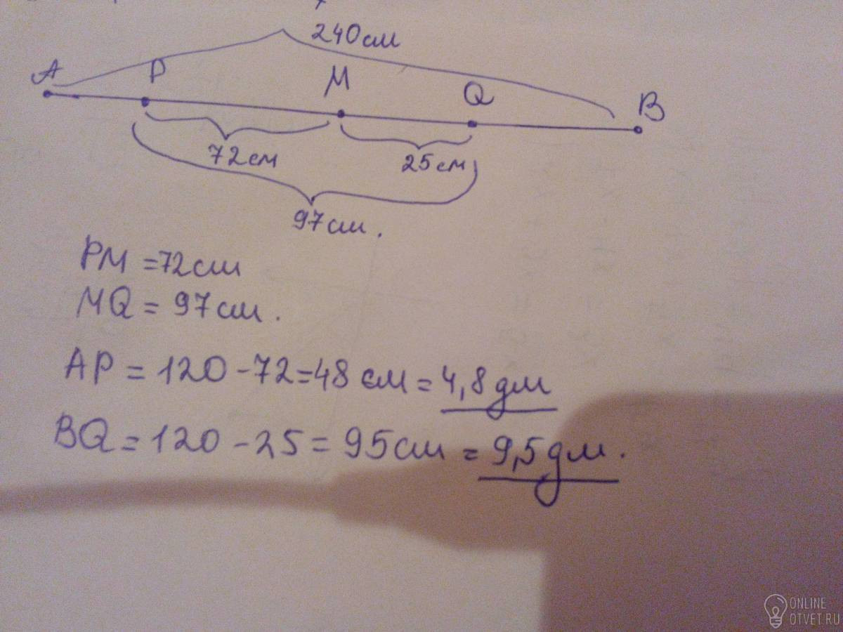 От середины М отрезка АВ, равного 2,4 м, отложены на прямой АВ отрезки МР=72 см и MQ=0,25 м. найдите длины отрезков АР и ВQ в дециметрах, если PQ=97 см