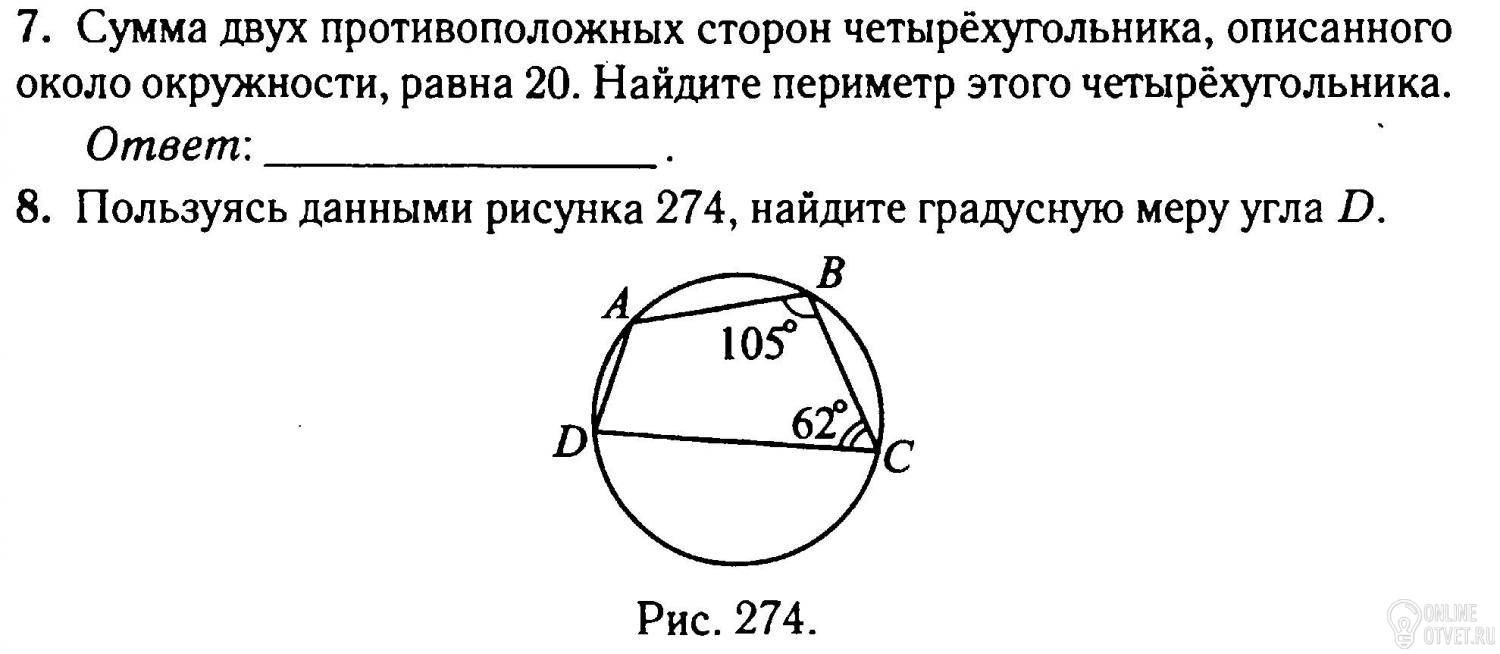 7. Свойства описанного четырехугольника. Суммы противоположных сторон равны. Одна сумма двадцать, вторая двадцать - периметр сорок.