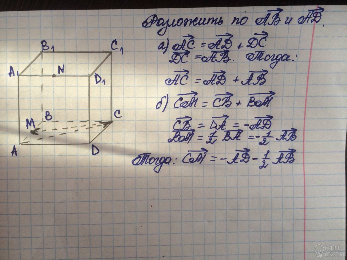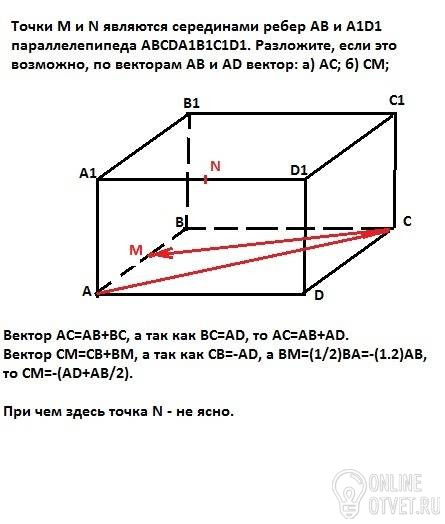 Точки М и N являются серединами ребер АВ и A1D1 параллелепипеда ABCDA1B1C1D1. Разложите, если это возможно, по векторам АВ и AD вектор: а) AC; б) СМ;