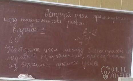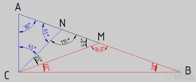 Гипотенуза треугольника - это диаметр описанной окружности, медиана из вершины прямого угла - радиус описанной окружности, значит АМ=СМ=ВМ и красный треугольник - равнобедренный, с углом при вершине равным 180 - 20 -20 = 140 градусов