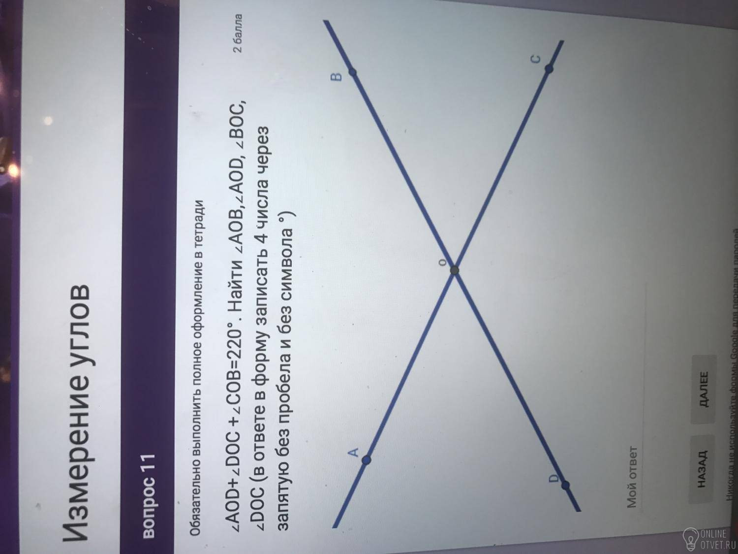 ответ: AOB=140 DOC=140 AOD=40 BOC=40