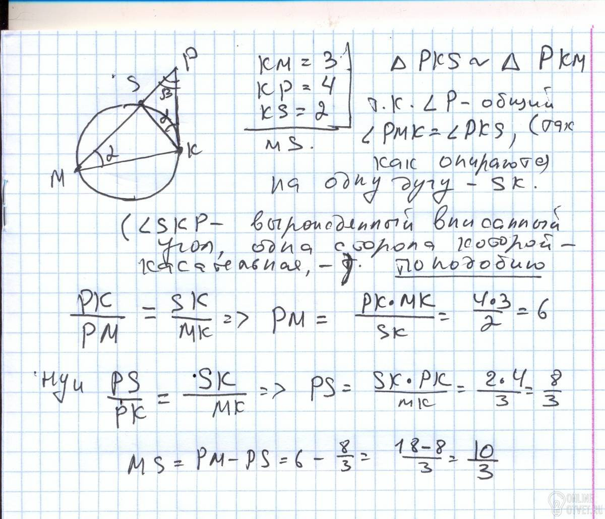 На стороне MP треугольника MPK взята точка S так,что окружность, проходящая через точки M,K,S, касается прямой KP. Найдите MS, если KM=3, KP=4,KS=2/