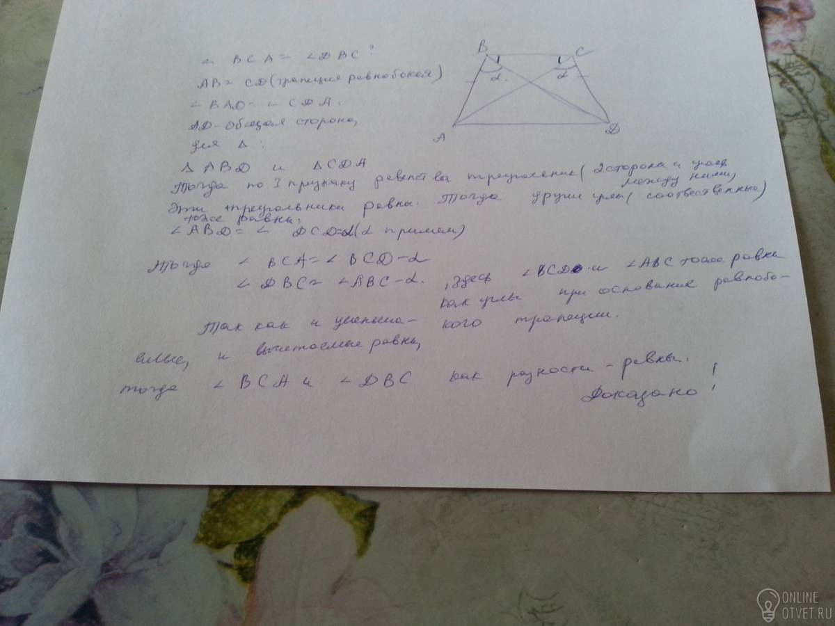 Доказать что диагонали равнобокой трапеции образуют равные углы с меньшим основанием . Заранее спасибо :3