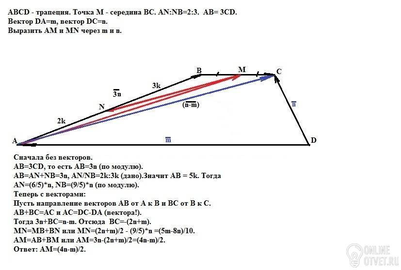 АВСD - трапеция. Точка М - середина ВС. AN:NB=2:3. AB= 3СD.