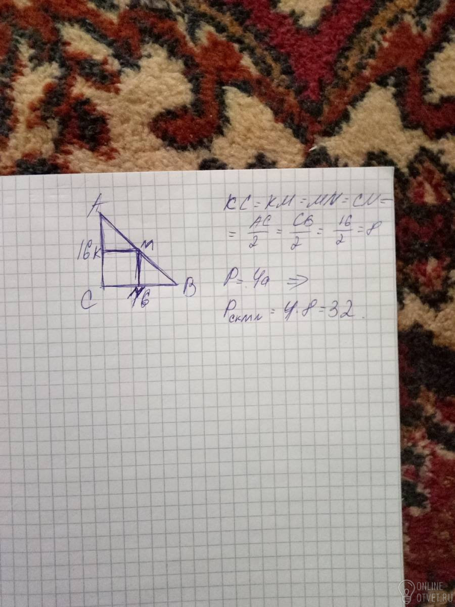 дан треугольник ABC в котором угол C =90 AC=CB=16см,и квадрат CKMN причём K пренадлежит AC,N пренадлежит CB, M пренадлежит АB.найдите периметр квадрата