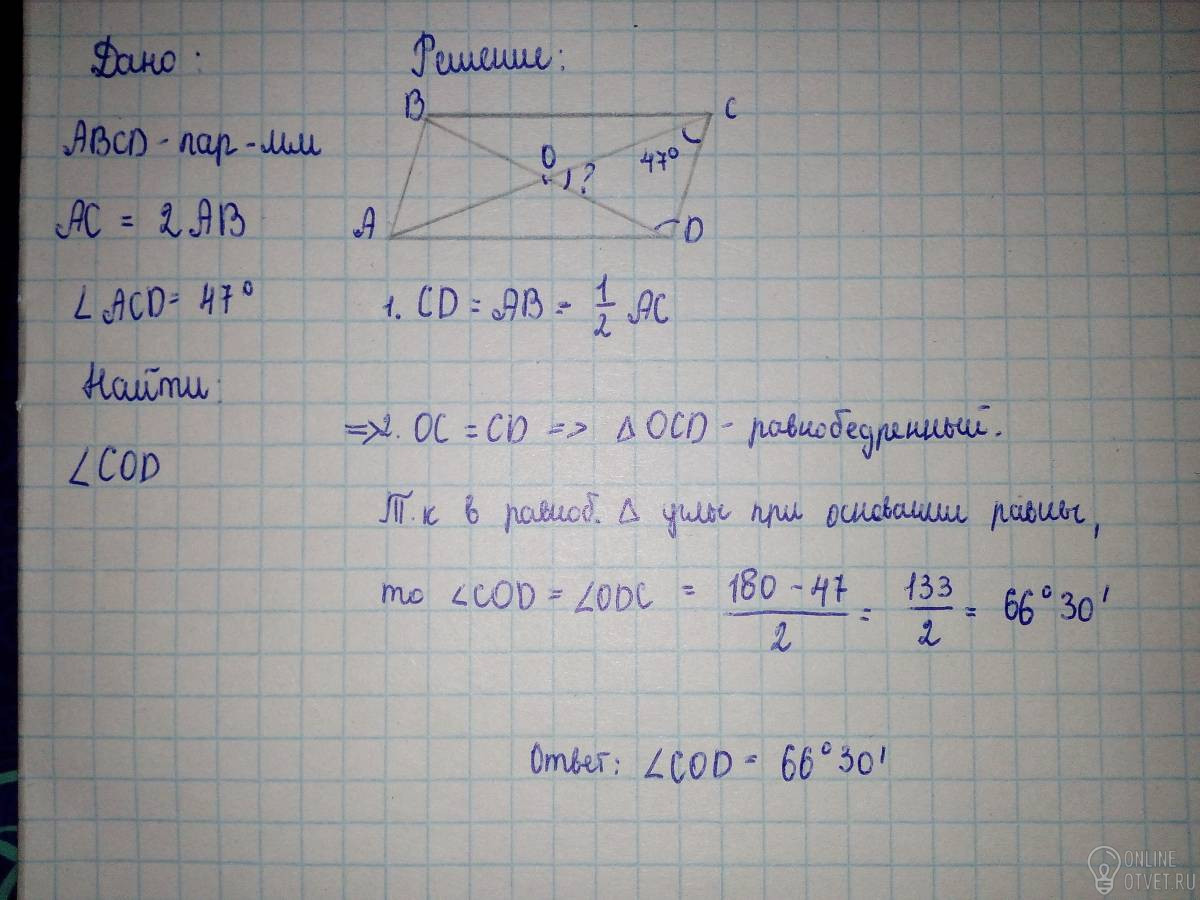 В параллелограмме ABCD диагональ AC в 2 раза больше стороны AB и угол ACD=47 градусам. Найдите острый угол между диагоналями параллелограмма. Ответ дайте в градусах.