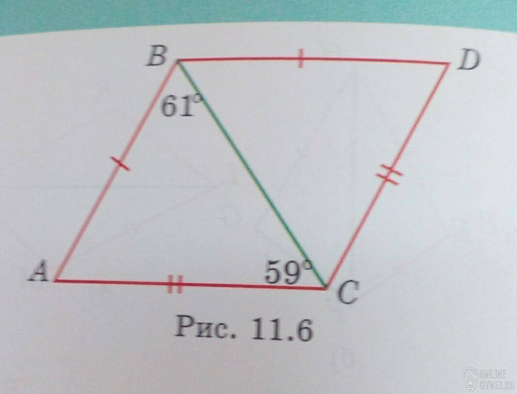 Треугольники равны по признаку равенства трёх сторон (две равны по условию, третья- общая). Значит, и углы при соответствующих сторонах равны. Угол ВСД равен 59°