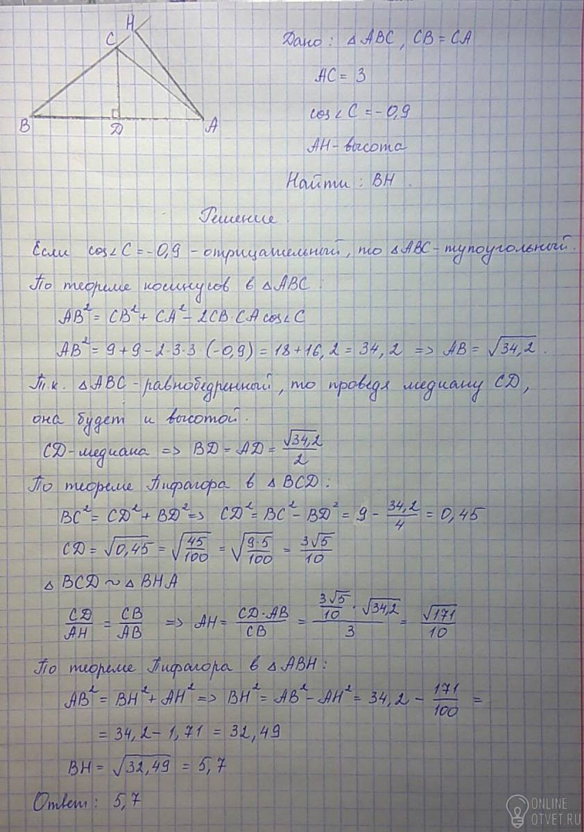 В равнобедренном треугольнике ABC с основанием AB длина боковой стороны равна 3, cosC равен -0,9, отрезок АH- высота найдите длину отрезка BH
