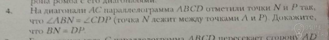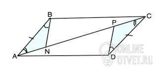 ∆ АВN=∆ СDP по второму признаку равенства треугольников, откуда следует равенство сходственных сторон. ⇒ BN=DP