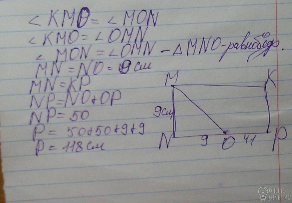 Найдите периметр прямоугольника mnpk если биссектриса угла M делит сторону NP на отрезки 41 см и 9 см