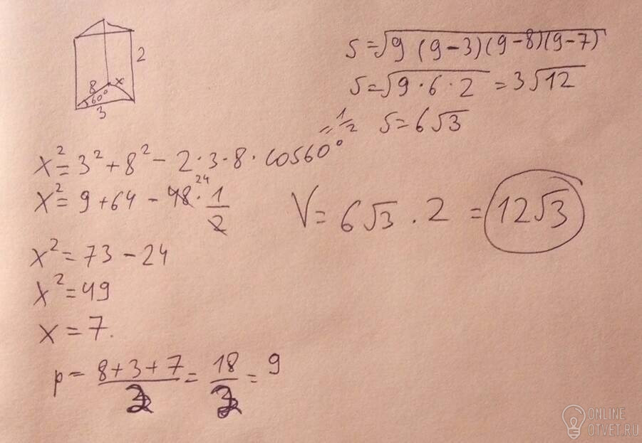 Данная прямая призма в основе которой лежит треугольник со сторонами 3 см и 8 см и углом между ними 60 °, а боковое ребро равно 2см.знайты объем призмы.